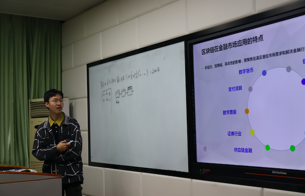 随后,汪涵锐同学与大家探讨了区块链在金融市场的应用及风险。他先是为大家归纳了区块链在金融市场应用的特点和风险,提到:目前的应用基本上都处于概念验证阶段,尚未大规模商用。各金融巨头如纳斯达克、摩根大通等也只是实验性地探索区块链应用。此后,他进一步对风险进行具体解释和论证,并以数字货币为例深入探究具体可能产生的风险。汪涵锐同学相继指出其中的消费者保护风险、金融稳定风险以及ICO带来的问题等,逻辑缜密、语句顺畅,令在座的同学们信服。