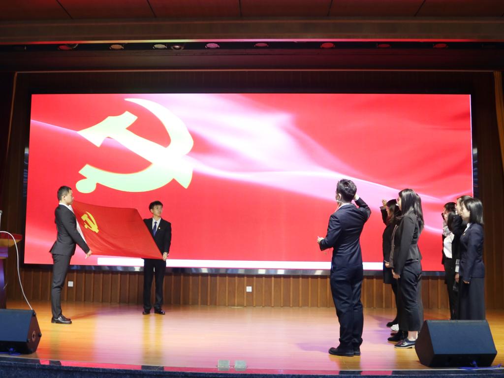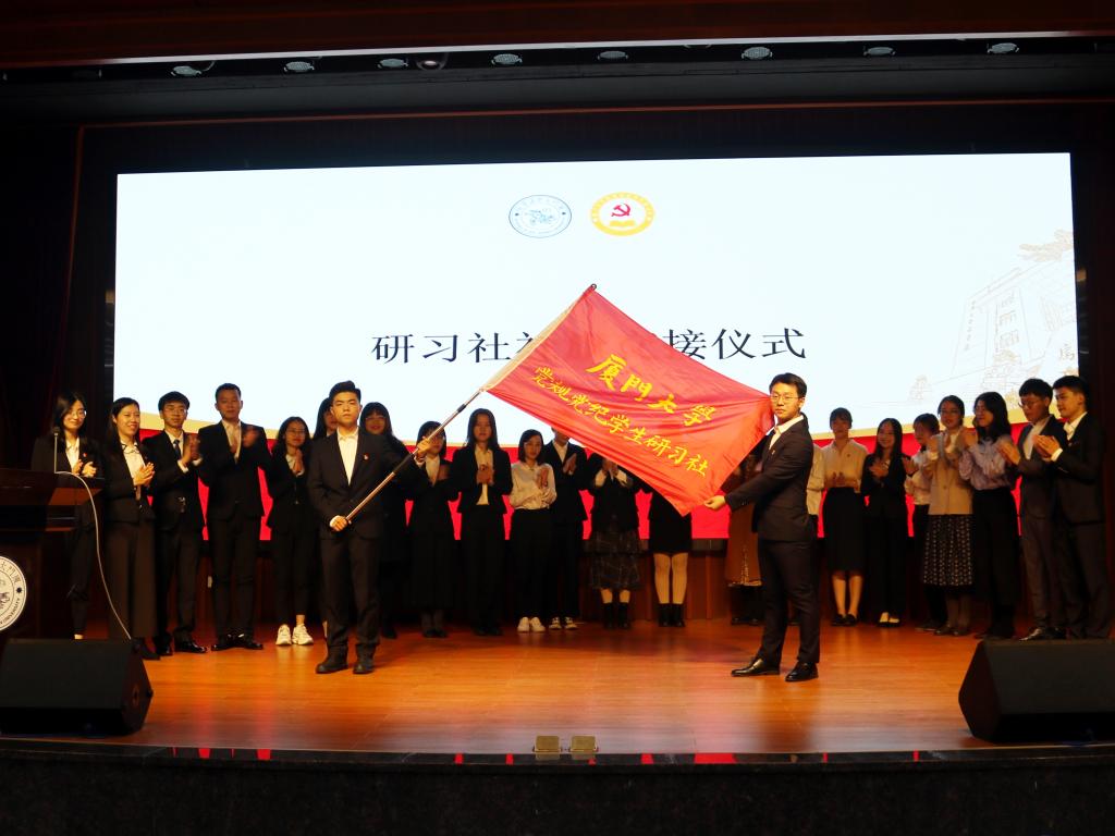随后,研习社新一届社长徐瑞祥同学与第二届社长张浩同学进行了社旗交接仪式,并由徐瑞祥同学带领研习社第三届社团骨干成员重温入党誓词,在誓词宣誓中坚定了不忘初心、牢记使命的信念。