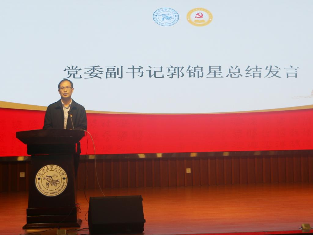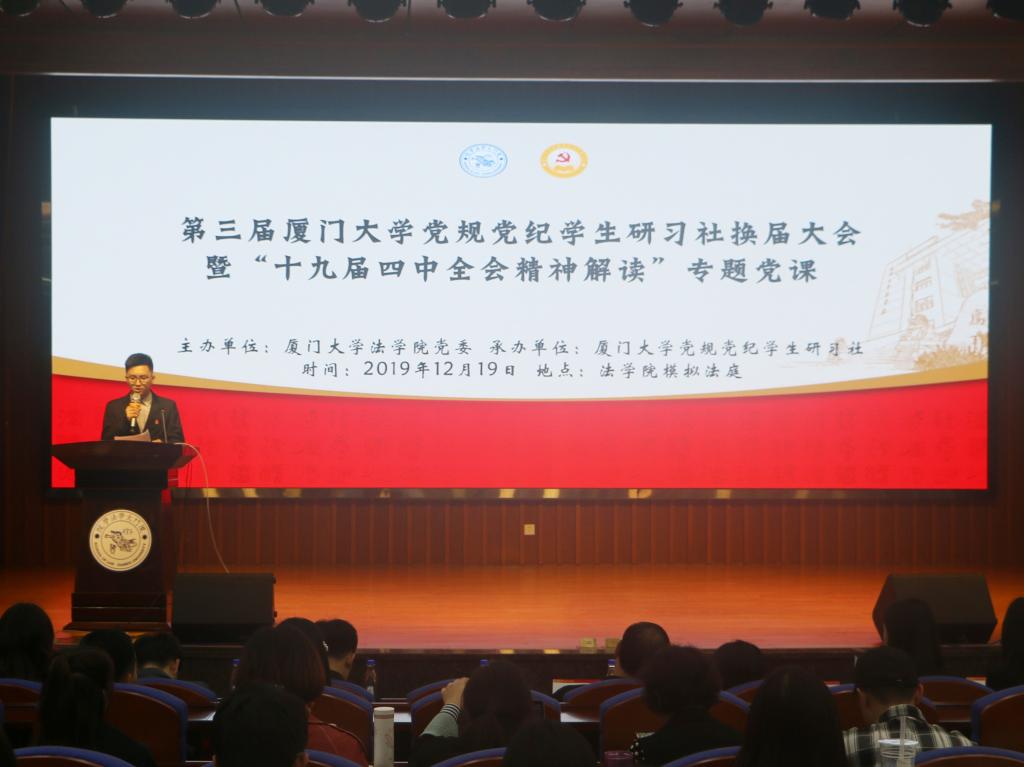 2019年12月19日下午,厦门大学第三届党规党纪学生研习社换届大会暨“十九届四中全会精神解读”专题党课在yl8cc永利官网模拟法庭成功举行。yl8cc永利官网党委副书记郭锦星,集美大学法学院副教授郑贤宇,yl8cc永利官网团委副书记、研习社社团指导老师杨璐及研习社骨干成员、yl8cc永利官网全体研究生党员出席了本次会议。本次会议由第二届厦门大学党规党纪学生研习社宣传部部长杨艺荣主持。