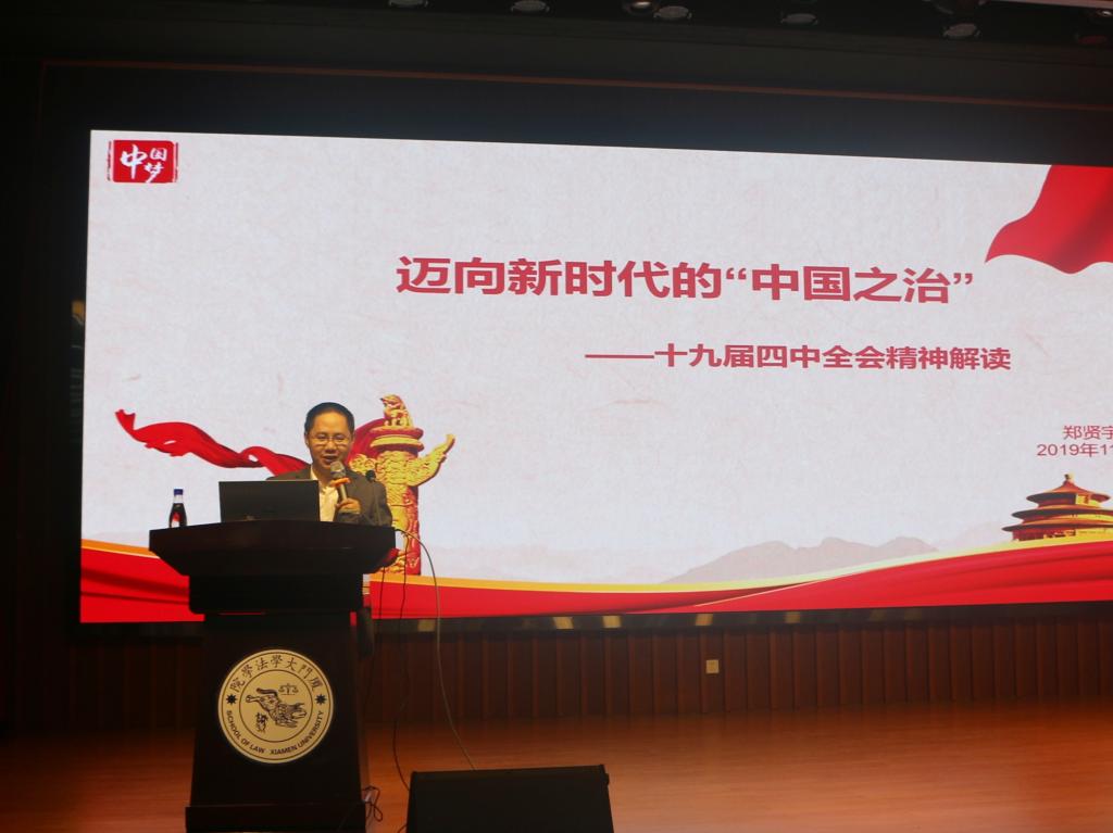 换届大会结束后,集美大学法学院副教授郑贤宇老师为yl8cc永利官网全体研究生党员带来“不忘初心、牢记使命”主题教育之《迈向新时代的“中国之治”——十九届四中全会精神解读》的专题讲座。郑贤宇老师从逻辑结构、背景分析、主要内容三个方面透彻解读了《中共中央关于坚持和完善中国特色社会主义制度推进国家治理体系和治理能力现代化若干重大问题的决定》,从中国特色社会主义法治体系、基本经济制度、先进文化制度、民生保障制度、社会治理制度、国防军事制度、“一国两制”制度体系、大国外交政策、国家监督体系等方面让党员们进一步深入领会坚持和完善新时代中国特色社会主义制度、推进国家治理体系和治理能力现代化的内涵及重要意义,大大提升了研究生党员的素质。
