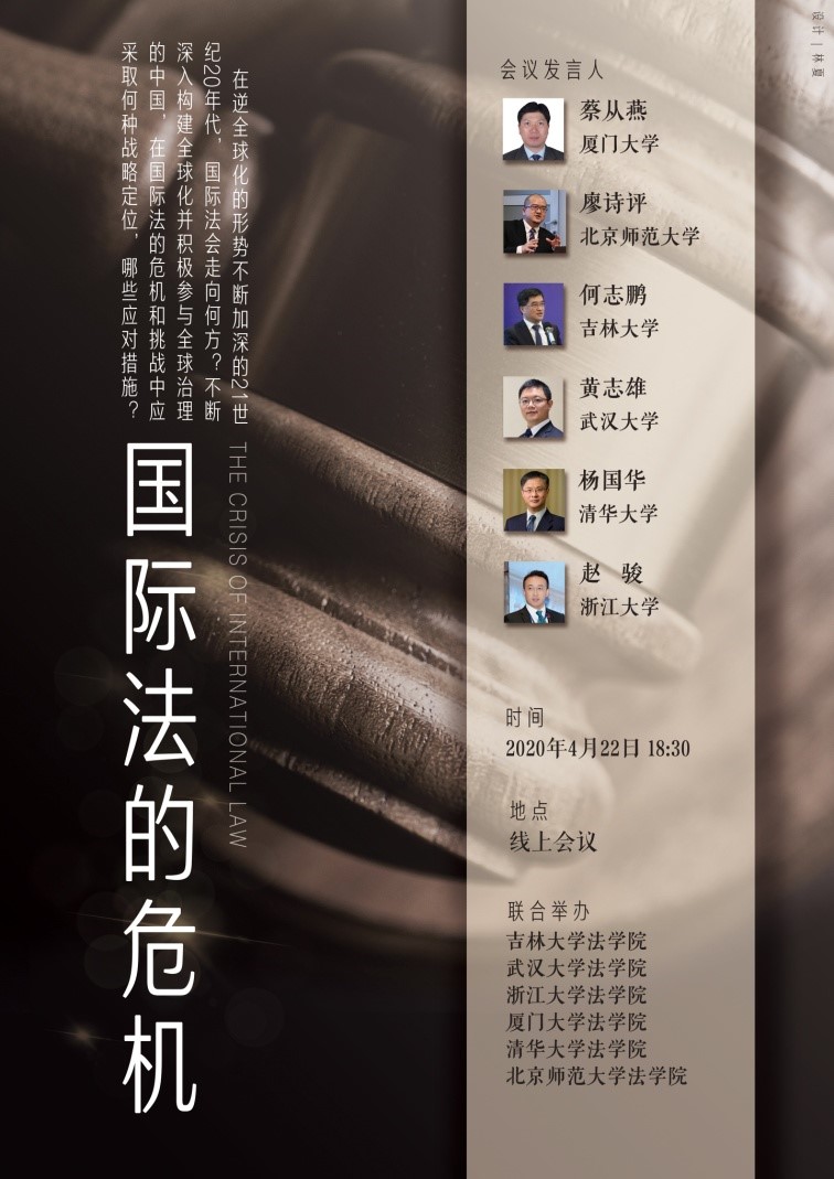 近年来,逆全球化的势头日益上升,国际合作在政治、经济、环境、军备等领域面临着诸多困难。而今年年初发生的公共健康紧急状态全球蔓延,更是使得国际法遇到了前所未有的危机。如何看待当前的国际法状况,如何化解危险、抓住机遇,使国际法能够更好、更快的发展,是全球国际法学人都广泛关注和不断追问的问题。为了回答这一问题,吉林大学法学院、武汉大学法学院、浙江大学法学院、yl8cc永利官网、清华大学法学和北京师范大学法学院联合召集有关学者,于2020年4月22日召开了“国际法的危机”线上研讨会。会上,各位专家畅所欲言,探讨了国际法危机的表现、成因及可能的解决思路。