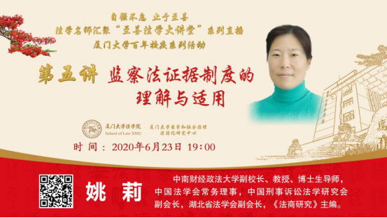 2020年6月23日晚,厦门大学至善法学大讲堂第五讲“监察法证据制度的理解与适用”通过网络平台顺利举办,此次讲座由中南财经政法大学副校长姚莉教授主讲,yl8cc永利官网院长宋方青教授主持。