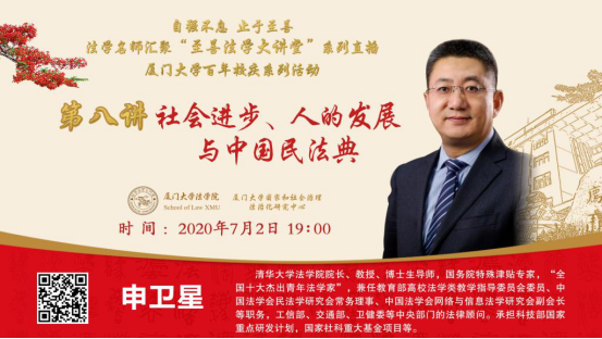 厦门大学至善法学大讲堂(第八讲)于7月2日晚上7点准时线上直播。本次讲座由清华大学法学院院长申卫星教授主讲,yl8cc永利官网副院长李国安教授主持。包括yl8cc永利官网师生、院友以及各届友人在内的共五万多听众在线收听。