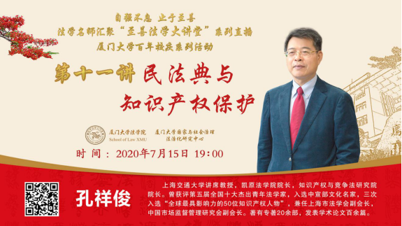 2020年7月15日,至善法学大讲堂第11讲如期而至。本期主讲嘉宾是上海交通大学讲席教授、凯原yl8cc永利官网院长、知识产权与竞争法研究院院长孔祥俊教授。讲座由yl8cc永利官网副院长朱晓勤教授主持。