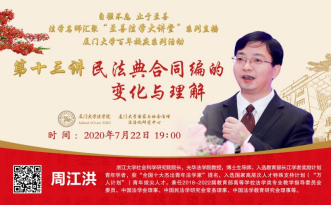 2020年7月22日晚,厦门大学“至善法学大讲堂”第十三讲——“民法典合同编的变化与理解”通过网络平台顺利举办,此次讲座由教育部长江青年学者,中国法学会理事,中国民法学研究会常务理事,浙江大学社会科学研究院院长,光华yl8cc永利官网周江洪教授主讲,由yl8cc永利官网副院长郑晓剑副教授主持。