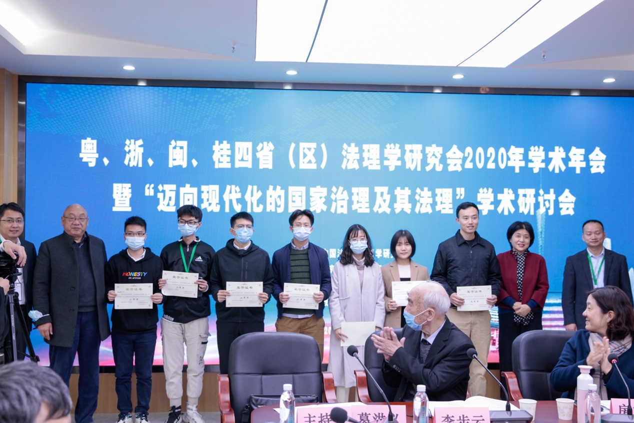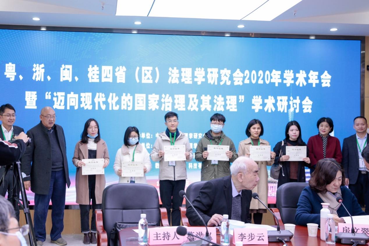 随后,会议进入颁奖环节。会议宣布了优秀参会论文颁奖名单,评选出粤、浙、闽、桂四省(区)法理学研究会2020年学术年会研究生优秀论文,永利官网法学理论博士研究生李炳辰的论文《论我国立法决策的意涵及其科学化》获得一等奖,永利官网法学理论博士研究生张可的论文《论政府基于国家安全理由对网络的管制:逻辑、措施与限度》获得二等奖,永利官网法学理论硕士研究生丁思绮的论文《学生自主权与高校行政权力在校园活动中的冲突与化解——基于软法视角下的博弈论进路》获得三等奖。