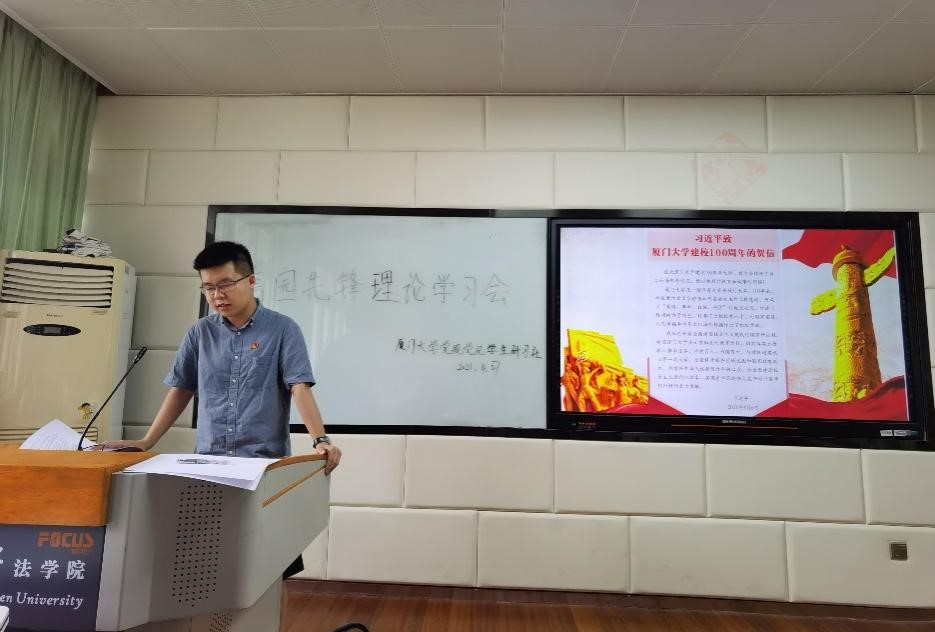 研习社副社长颜成志领学了习近平总书记致厦门大学建校100周年的贺信精神、习近平总书记在清华大学考察时的重要讲话精神。他首先带领同学们重温了贺信全文,号召大家要不负总书记的殷切期望,大力弘扬“嘉庚精神”,积极传承“爱国、革命、自强、科学”的优良校风,学好专业本领,提升综合素养,为中国特色社会主义法治建设贡献力量。随后,他在会上传达了《中共教育部党组关于教育系统深入学习贯彻习近平总书记在清华大学考察时重要讲话精神的通知》相关要求,强调在接下来的党史学习教育中,要以“单元式”学习为抓手,学好“发展”“改革”“青年”“师德”“党建”等五个单元,切实领会习近平总书记关于高等教育的新任务新要求。