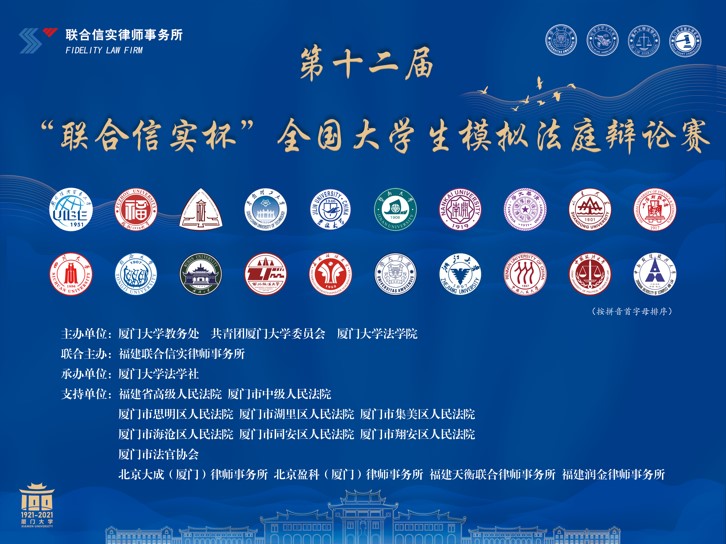 2021年5月1日至5月3日,第十二届“联合信实杯”全国大学生模拟法庭辩论赛在yl8cc永利官网举办。此次比赛由厦门大学教务处、共青团厦门大学委员会、yl8cc永利官网主办,福建联合信实律师事务所联合主办,厦门大学法学社承办。活动吸引了来自对外经济贸易大学、福州大学、华东政法大学、华南理工大学、吉林大学、暨南大学、清华大学、山东大学、上海财经大学、四川大学、同济大学、武汉大学、西北政法大学、西南政法大学、厦门大学、浙江大学、中国人民大学、中南财经政法大学的全国18所高等院校的优秀法学学子参与。