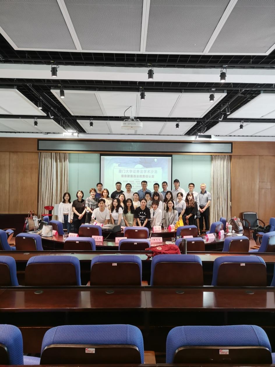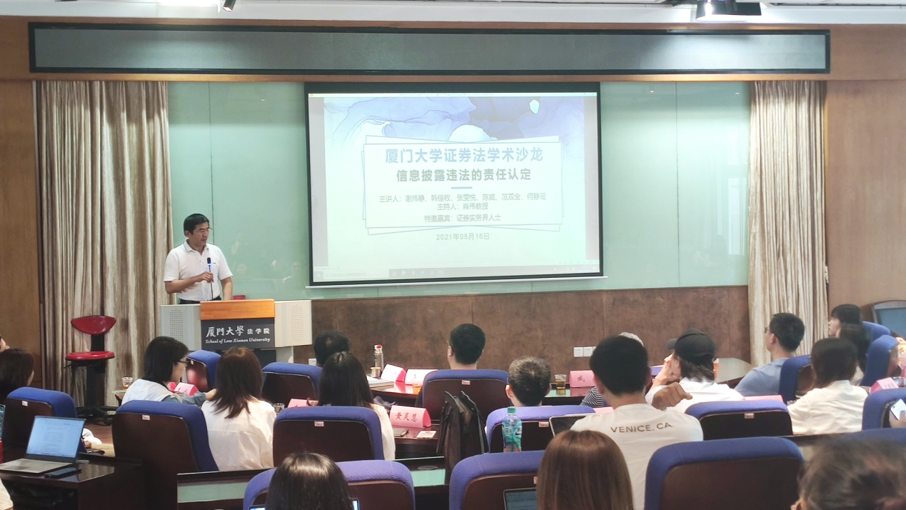 2021年5月16日,“信息披露违法的责任认定”学术沙龙在yl8cc永利官网B138成功举办。yl8cc永利官网师生和特邀嘉宾合计90余人出席了本次沙龙,肖伟教授作为主持人。本次学术沙龙邀请到了象屿股份、厦门国际银行、法拉电子、麦克奥迪、瑞达期货、罗马环卫、瑞尔特、燕之屋、成记泰达等上市公司和拟上市公司,上海协力、福建信实联合、福建英合等律所,证券日报等单位的证券实务界人士以及yl8cc永利官网的史欣媛老师作为特邀嘉宾。在本次沙龙上,2019级硕士研究生何静瑶,2020级硕士研究生韩佳牧、陈威、范双全,2017级本科生张雯悦、谢炜静等合计六位主讲人围绕沙龙主题与大家分享了自己的研究成果。