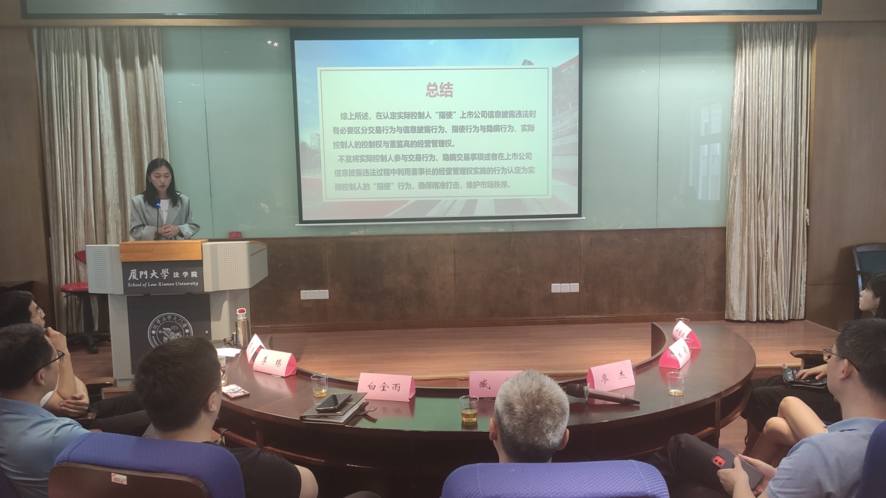 第五位主讲人范双全同学,她展示的内容为“实际控制人‘指使’上市公司信息披露违法的辨析”。