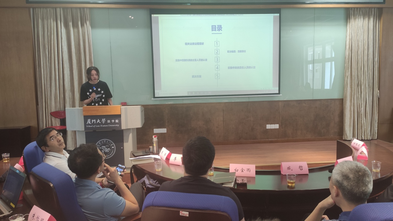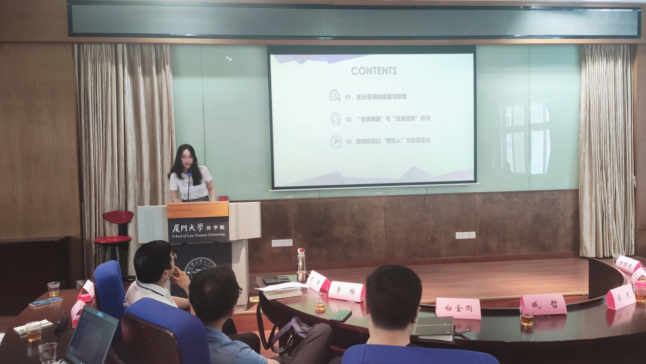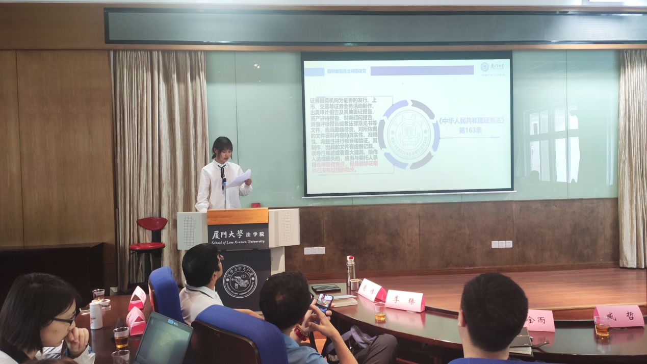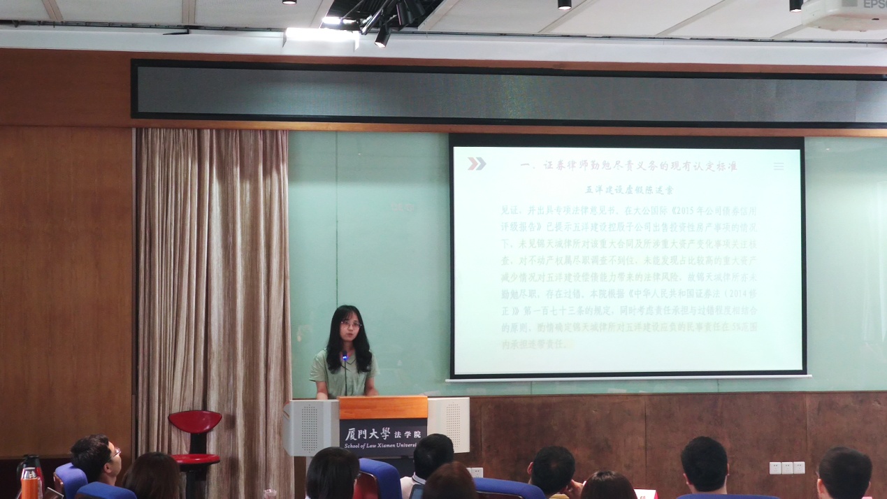 第一位主讲人是谢炜静同学,探讨的题目为“证券律师在上市公司信息披露中勤勉尽责义务的认定标准”。