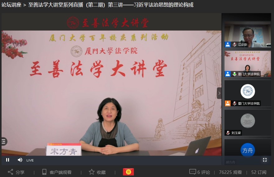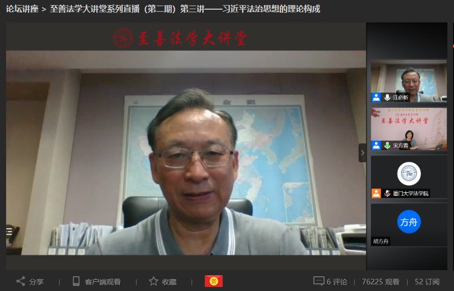 中国共产党第十九次全国代表大会代表、第十三届全国人大代表、第十三届全国人民代表大会宪法和法律委员会副主任委员、中国法学会副会长江必新教授做客yl8cc永利官网至善法学大讲堂(第二期),主讲《习近平法治思想的理论构成》,讲座由yl8cc永利官网院长宋方青教授主持。