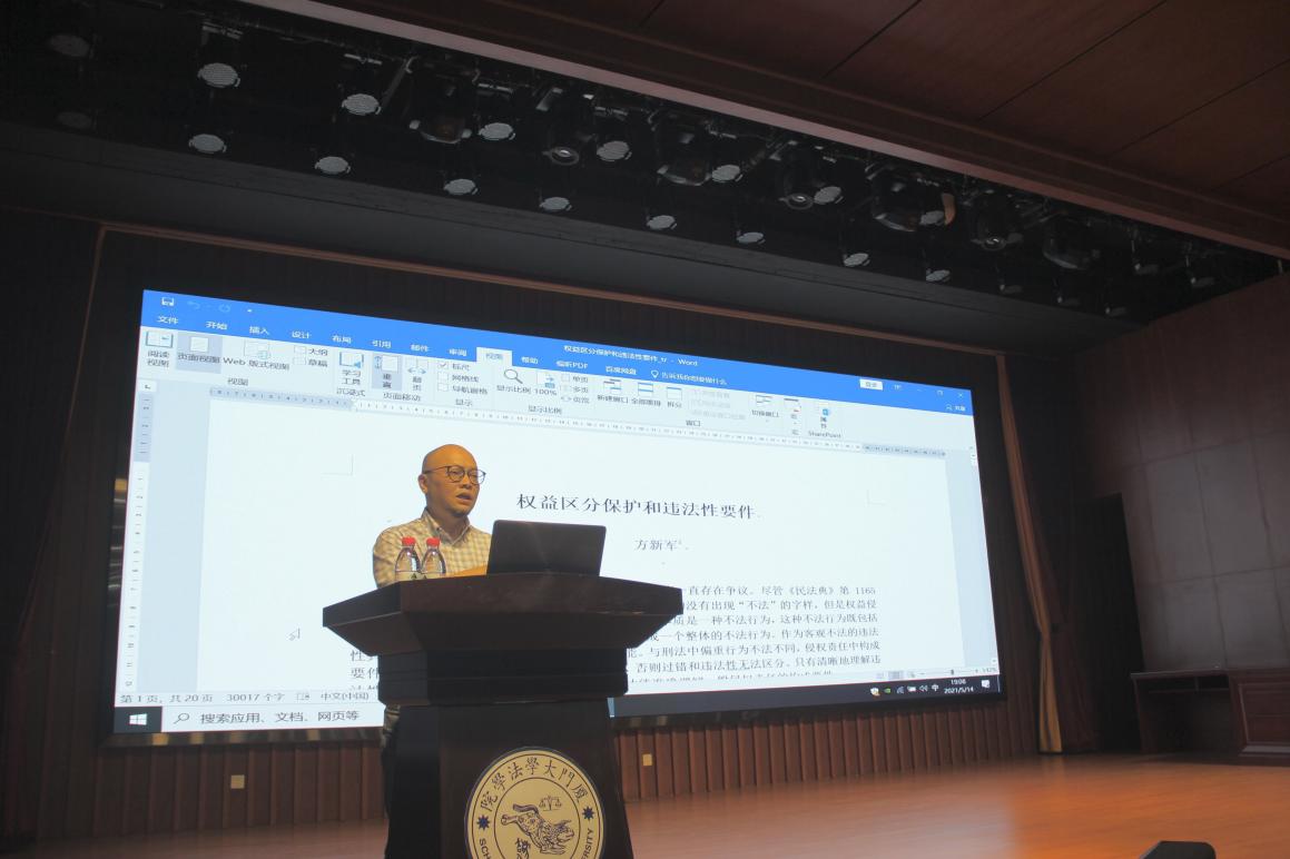 2021年5月14日晚7点,yl8cc永利官网师生期待已久的,主题为《权益区分保护和违法性要件》讲座在yl8cc永利官网模拟法庭如期举行。本次讲座有幸请到了苏州大学王健yl8cc永利官网院长、博士生导师、江苏省法学会副会长、中国民法学研究会常务理事方新军教授作为主讲嘉宾,yl8cc永利官网郑永宽教授担任本次讲座主持人。现场参加人员还包括yl8cc永利官网徐国栋教授、何丽新教授、郑晓剑副院长、齐云助理教授,此外还有不少慕名而来的校友,以及研究生、本科生出席聆听,求知氛围浓厚,现场气氛甚佳。