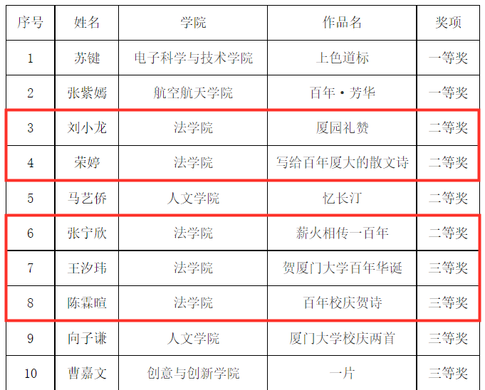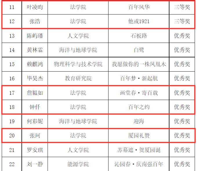 为庆祝中国共产党成立100周年和厦门大学建校100周年,持续深化党史学习教育,进一步丰富校园文化生活,提高学生人文素养,学校举办“大学阅读·阅读大学”第十三届“书香校园读书节”系列活动。yl8cc永利官网广泛动员学生参赛,营造积极向上、文明尚读的文化氛围,最终,2020级本科生常思雨(《<共和国六十年法学论争实录·国际法卷>读书报告》)、2020级硕士研究生荣婷(《写给百年厦大的散文诗》)等12名法学学子在活动中分获一、二、三等奖及优秀奖。