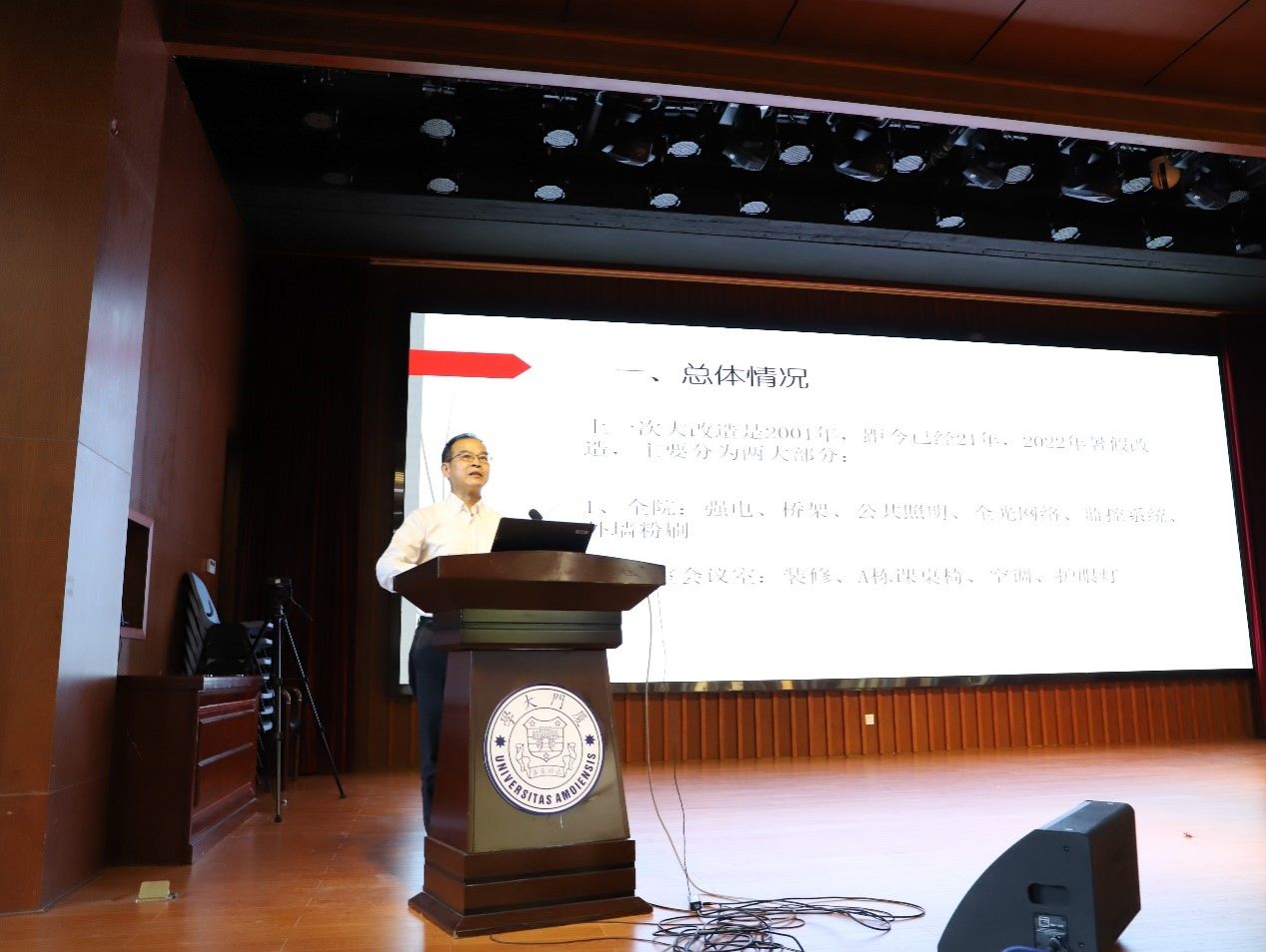 李国安副院长代表学院扩建与修缮项目工作小组,向全院教职工详细介绍了yl8cc永利官网2022年暑期改造情况。修缮工作组克服疫情等实际困难对学院的教室、会议室等进行改造,效果良好。