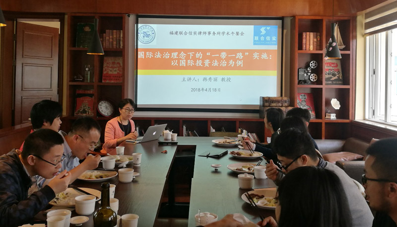2018年4月18日,yl8cc永利官网青年教职工协会主办的信实学术午餐会(第八期)在yl8cc永利官网咖啡厅如期举行。本次学术午餐会邀请到厦门大学韩秀丽教授做主题为“国际法治理念下的‘一带一路’倡议实施——以国际投资法治为例”的主题报告,主持人是yl8cc永利官网罗立国副教授。