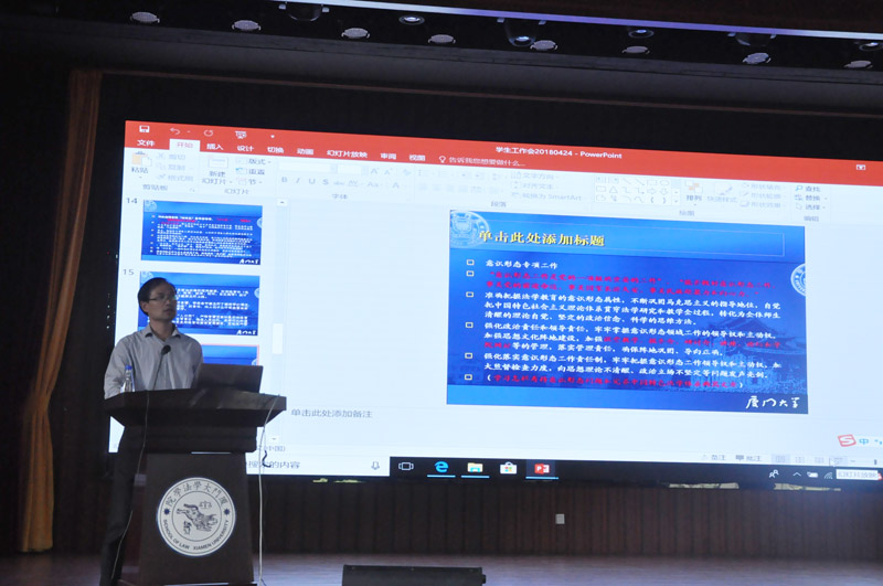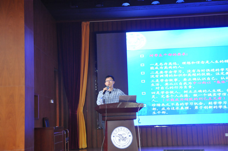 会议第二项议程,高斌老师重点讲解了安全维稳工作。他分别从重要节点维稳、交通出行安全、游泳安全、防火防盗、防诈骗、宿舍安全、毒品问题、防范艾滋病问题等方面入手,对学生骨干进行了全方位安全教育动员和工作任务布置。他重点强调了,公安局“扫黑除恶”专项行动对校园贷的打击、防诈骗金点子征集活动、宿舍用电安全等方面的注意事项,对学生防诈骗提出了很多实用的建议,并要求学生干部们做好工作任务的传达和信息反馈。