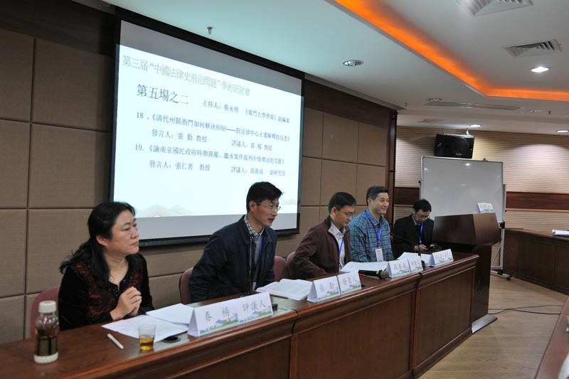 第五场报告会由《厦门大学学报》蔡永明副编审主持。第一位报告人是台湾嘉义大学教育系刘馨珺副教授,报告题目为《从< 为人兴利判>论唐判的生活法令与法律知识——兼述台湾< 唐律研读会>近三年活动》,刘教授简要介绍台湾唐律研读会近三年从唐判到《宋刑统》的研读情况,并展示其中对《文苑英华·判·为政门》的《为人兴利判》这篇判文的解读报告。第二位报告人是中国社会科学院历史研究所刘晓研究员,报告题目为《元朝法律渊源与法律体系的构建》,叙述元朝法制从大规模援引亡金法律、旧例,到因事制宜、因时立制的发展进程,并归纳元朝法律体系对明初立法的影响;第三位报告人是天津财经大学法学院张勤教授,报告题目为《清代州县衙门如何解决纠纷——对法律中心主义解释的反思》,以现有的依据地方档案形成的研究成果为基础,尽可能还原清代州县纠纷解决的实态,并从纠纷解决多元的理论视角出发,从更多元的、包容的角度分析和阐释处于前近代时期的中华文明对待纠纷和秩序的态度和技术;第四位报告人是南京大学法学院张仁善教授,报告题目为《论南京国民政府时期亲属、继承案件裁判中情理法的交汇》,通过分析南京国民政府时期的亲属、继承案件裁判,说明司法主体在民法文本与社会实际之间的缓冲作用,以及司法实践对情理法的兼顾。中国社会科学院法学研究所张少瑜研究员、云南大学滇西研究院胡兴东教授、中南财经政法大学法学院春杨教授、中国社会科学院法学研究所高汉成副研究员分别进行评议。