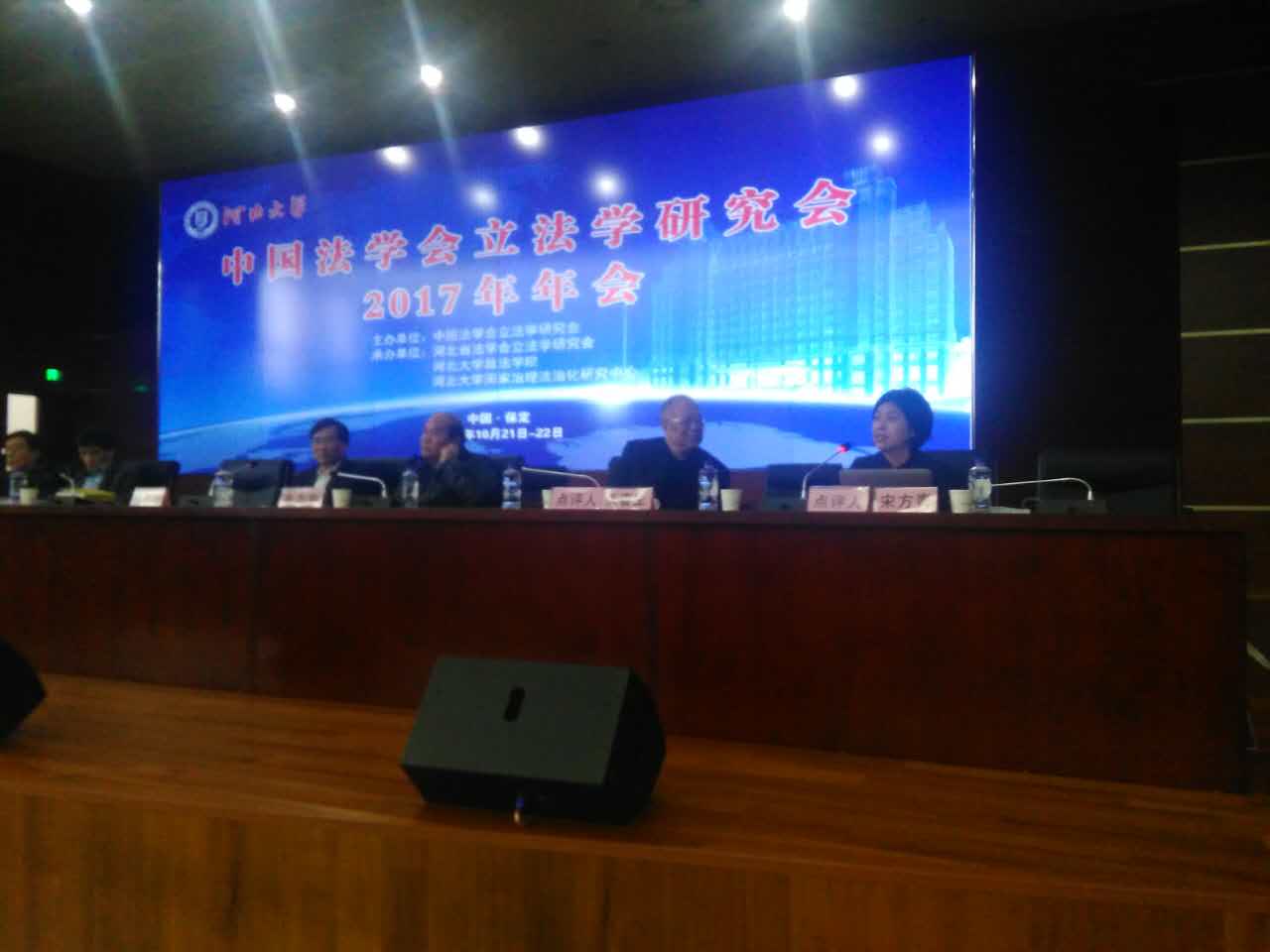 10月21-22日,由中国法学会立法学研究会主办,河北省法学会立法学研究会、河北大学政yl8cc永利官网和河北大学国家治理法治化研究中心共同承办的中国法学会立法学研究会2017年学术年会在河北大学大学隆重召开。中国法学会副会长郞胜、全国人大法工委副主任许安标、河北省人大常委会副主任宋长端、中国法学会原副会长周成奎、中国立法学研究会第一届会长张春生和来自全国各地的立法学专家、立法实务工作者共300余人参会,收到学术论文190余篇。中国立法学研究会副会长、yl8cc永利官网院长宋方青教授、博士生王翔、程庆栋参加会议。