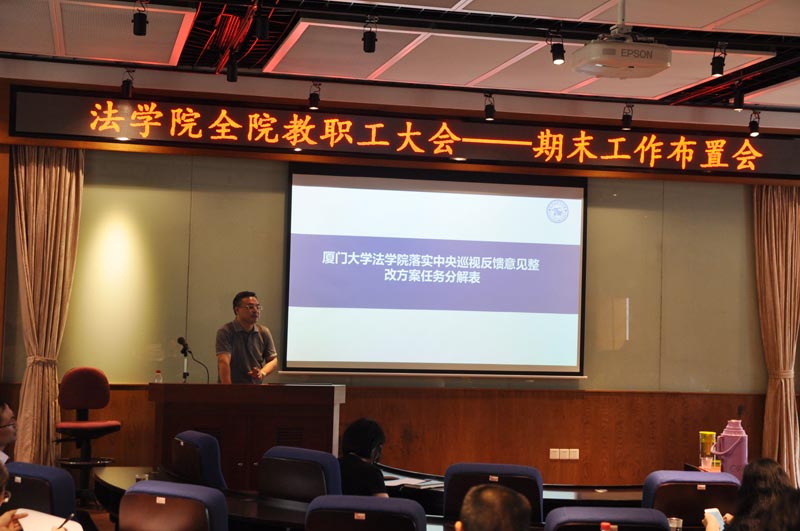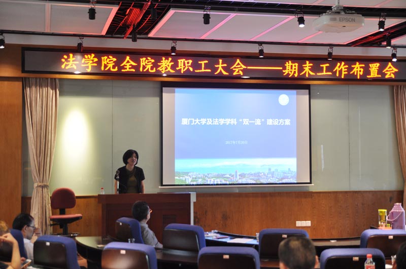 yl8cc永利官网院长宋方青介绍了厦门大学及法学学科“双一流”建设方案。她从教育部通知的有关精神,学校“双一流”总体考虑,以及法学学科“双一流”建设三个方面对该方案进行阐述。宋方青表示,“双一流”建设是学校的一项重大事件,时间紧,任务重,希望yl8cc永利官网全体教师以高度的责任感和使命感,投入到“双一流”的建设中,为学校以及法学学科的发展做出应有的贡献。