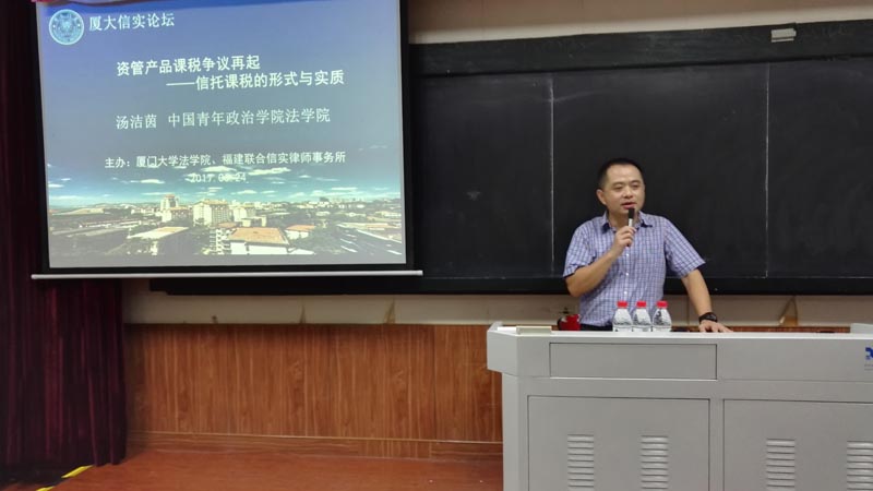 2017年6月24日晚,永利官网与福建联合信实律师事务所合作举办的厦大信实论坛,邀请到中国青年政治学院yl8cc永利官网汤洁茵副教授,于A302教室举行了一场以“资管产品课税争议再起——信托课税的形式与实质”为名的讲座。本场讲座同时也是yl8cc永利官网青年教师协会的系列讲座之一,旨在邀请优秀的中青年教师来院进行学术交流。厦门大学国际税法与比较税制研究中心副主任、财税法教研室主任李刚副教授担任主持,王宗涛助理教授、厦门德勤会计师事务所的嘉宾,以及财税法专业或者方向的硕博士研究生、第三届税务律师培训班的学员等三十余人参加了讲座。