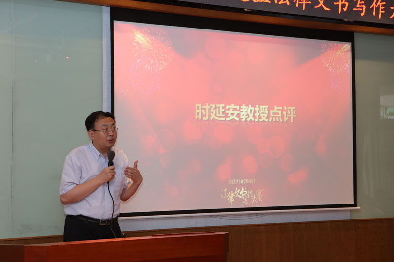 组委会评委代表时延安老师对参赛选手的成果给予点评,对参赛法律文书提出了完善的意见和建议。时延安教授总结此次法律文书的总体感受,提炼出三个要点——体例规范、着重说理、法治信念。他肯定了同学们对争议案件处理中所展现的对公民权利和法治正义权威的尊重和维护,对同学们扎实专业术语和说理能力也给予较高评价。