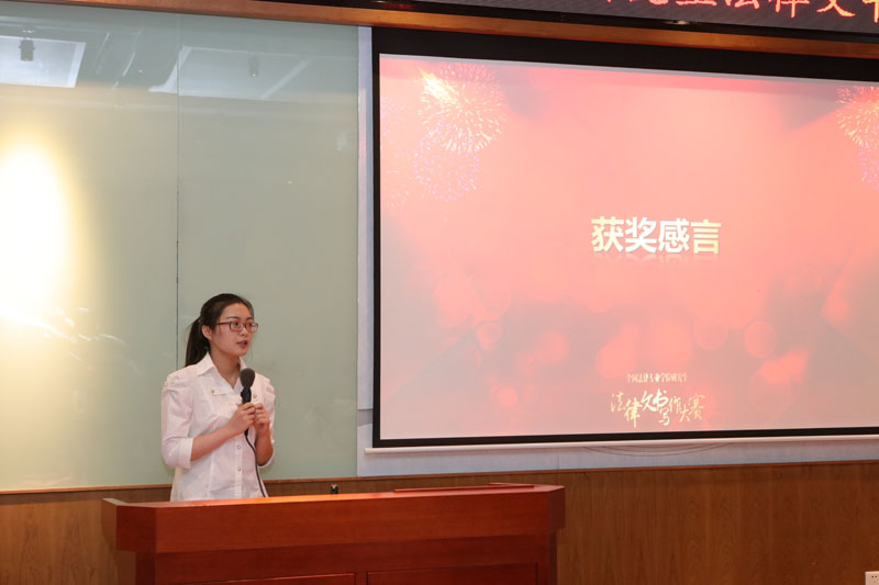 一等奖获奖选手中国海洋大学的陈心怡同学分享了参与竞赛的心路历程。她认为法律文书是法律人的名片,法律文书写作能力是检验法律人的有力工具,她结合自身在比赛中所遇到的问题提出建议与大家共勉。