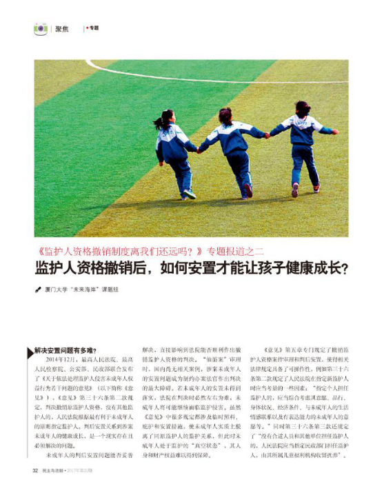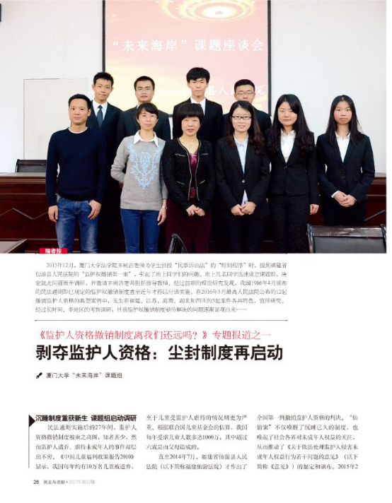 2017年6月9日,中央政法委主管、中国法学会主办的刊物《民主与法制》2017年第21期刊登了两篇永利官网“未来海岸”课题组撰写的调研报告:《剥夺监护人资格:尘封制度再启动》和《监护人资格撤销后,如何安置才能让孩子健康成长?》。