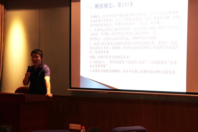 讲座在诙谐幽默的氛围下开始。郑教授首先谈到本次讲座将从法律比较的角度展开。讲座分为五个部分。第一部分是对《民法总则》第143条关于民事法律行为有效要件进行分析。郑教授认为本条规定法律行为的有效要件,是在法律行为成立基础上对其效力的进一步判断,故须先有意思表示或意思表示一致,并对于该概括条款是否具有规范意义进行分析。第二部分是谈及规范体系,包括法律行为的有效要件有行为能力适格、意思表示真实、不得违反强制性规定和公序良俗。第三部分对行为能力进行探讨。郑教授认为《民法总则》第144条规定过于绝对,也与实践相矛盾,因为司法实践认同无行为能力人可进行与其智力状况相匹配的小额交易与纯获利益的法律行为。郑教授进而质疑对行为能力进行三分的必要性,提出按完全行为能力与非完全行为能力来进行划分的可能性。第四部分就意思表示真实要件方面进行深入分析。郑教授从通谋虚假意思表示、恶意串通、重大误解、欺诈、胁迫、乘人之危显失公平、“意思表示真实”方面瑕疵的法律效果等七个方面进行深入分析。第五部分有关不得违反强制性规定或公序良俗,郑教授认为判断违反强制性规定交易的效力,得从法有规定和法无规定来区分,有规定从规定,无规定看是否损害公共利益,而不能简单定性为有效或无效。