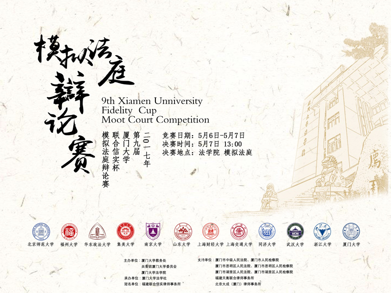 5月6日至5月7日,第九届厦门大学“联合信实杯”模拟法庭辩论赛在yl8cc永利官网举办。本次比赛由厦门大学教务处、共青团厦门大学委员会、yl8cc永利官网主办,厦门大学法学社承办,福建联合信实律师事务所冠名支持。厦门市中级人民法院、厦门市人民检察院、思明区人民法院、湖里区人民法院、思明区人民检察院、北京大成(厦门)律师事务所以及福建天衡联合律师事务所也对本次比赛给予了大力支持。