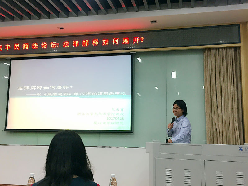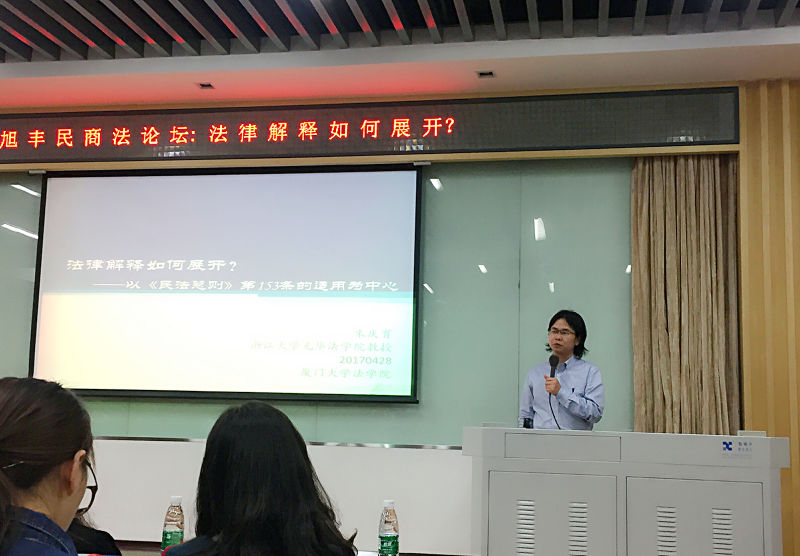 2017年4月28日晚,永利官网联合福建旭丰律师事务所举办的旭丰民商法论坛,邀请到浙江大学法学院光华学院教授、博士生导师朱庆育老师,于yl8cc永利官网B137教室分享一场以“法律解释的展开”为名的学术盛宴。