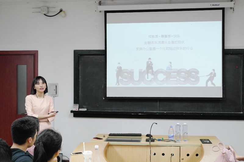 初见陈总,举手投足间彰显女性的自信和优雅,恰如陈总的名字“陈如茶般甘醇,平似水之柔情”,回眸间波澜不惊!接着便是幽默开场,陈总莞尔打趣自己是来“泼冷水”的,便一下消除了讲座初始的生分感。她进而解释道:“之前来的老师大多是给你们端心灵鸡汤,而我是来吐槽的,让你们提前了解行业的艰苦从而做出明智的选择以及充足的思想准备”。而后,陈总分别从四个方面来作专题讲解,包括家族办公室的概念、家族办公室的职能、家族办公室的发展现状以及金融法律人员的从业选择。
