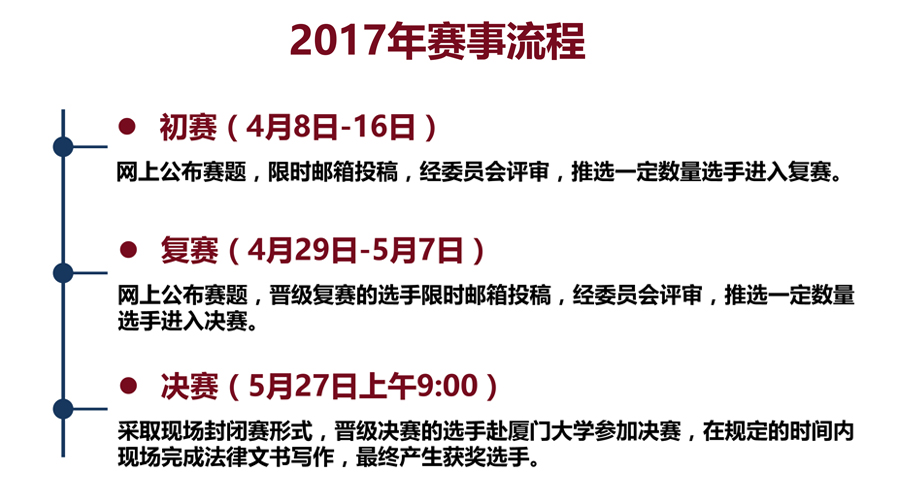 2017年初赛赛题已于4月8日对外公布,复赛赛题将于4月29日对外公布,请各位参赛选手关注赛事专题网页:http:/Paging/falvwenshu。