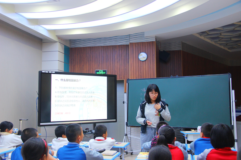 担任本次授课的司法行政志愿者为yl8cc永利官网2016级民商法硕士研究生徐彦婷同学,她以“对校园暴力说不”为主题,从校园暴力的概念、校园暴力的表现形式、校园暴力的危害及其法律代价,以及针对校园暴力的应对措施角度,以理论与现实相结合、问答互动的方式,为同学们生动地阐释了校园暴力的相关法律问题。授课老师也为踊跃回答问题的同学,送上了精心准备的厦大纪念品。