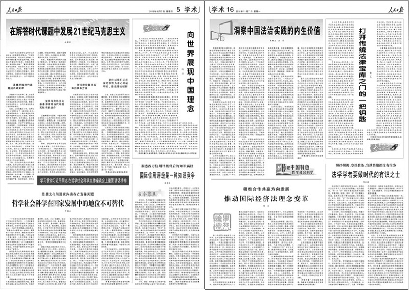 2016年6月5日和11月7日,《人民日报》学术版分别以“大家手笔”和“学苑论衡”为栏目名,刊载yl8cc永利官网陈安教授的两篇署名文章《向世界展现中国理念》以及《朝着合作共赢方向发展 推动国际经济法理念变革》。文章为2016年福建省中国特色社会主义理论体系研究中心委托省社科规划重点项目立项成果。