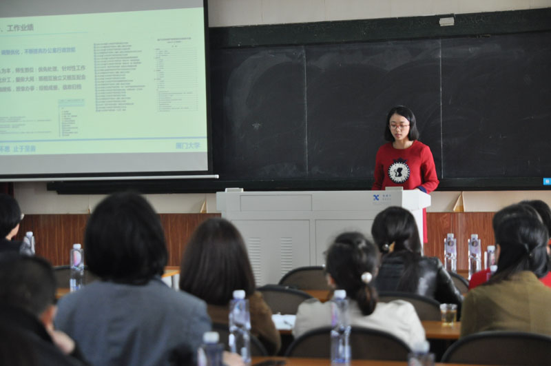 会上,全体科级及以下职员、实验技术人员和自聘人员按照指定次序作述职报告。每名述职者都以PPT的形式呈现述职报告,分别从工作业绩、存在问题及意见建议等方面,对一年来的工作进行总结。与会领导和教师认真听取各位行政工作人员的述职报告,并在评分表上就工作态度、工作表现等方面,对每名述职者进行评分。