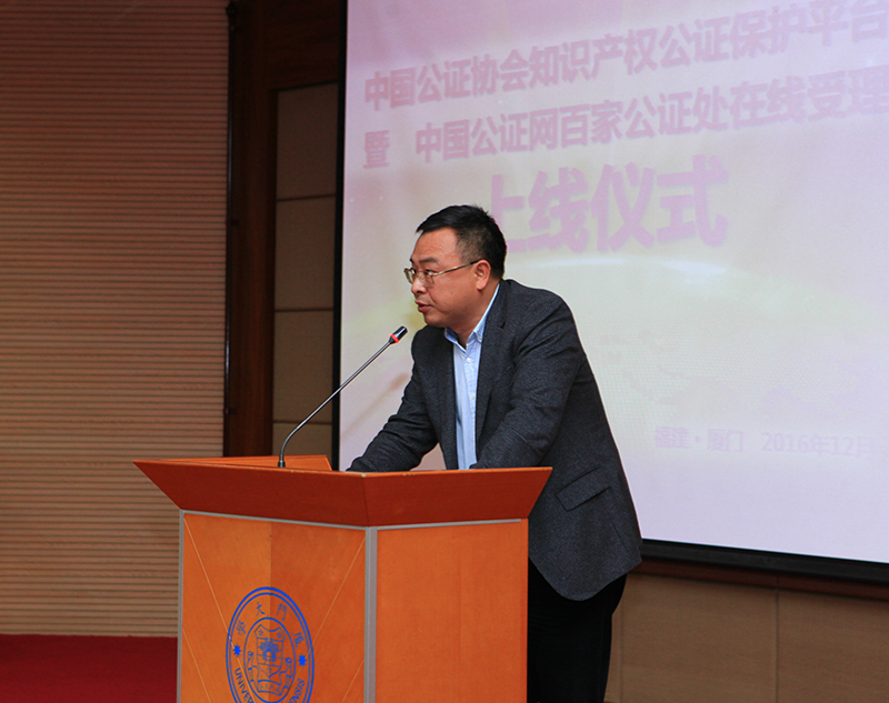 2016年12月16日上午,“中国公证协会知识产权公证保护平台暨中国公证网百家公证处在线受理上线仪式”在厦门大学克立楼隆重举行。中国公证协会丁露会长、福建省司法厅俞建春副厅长、厦门市司法局叶勇义局长、yl8cc永利官网李智勇书记等领导出席会议并致辞,厦门市中级人民法院吴丽雪副院长、厦门市知识产权局郭永明副局长以及全国10多个省市地区公证机构代表等150余人参会。