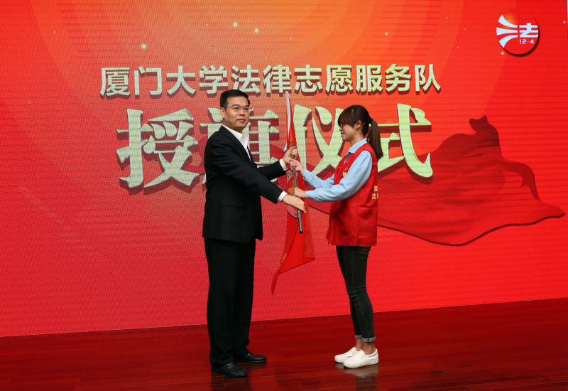 会上,市政府副市长林锐庄重地为厦门大学法律志愿服务队授队旗,将这份光荣而重要的责任交到了我校志愿者手中。厦门大学法律志愿服务队是厦门市司法行政法律志愿服务队第二十支分队,服务队以yl8cc永利官网学生为主体成员,将充分利用yl8cc永利官网优厚的学术资源,为广大师生以及市民群众提供专业法律咨询、普法宣传等服务。