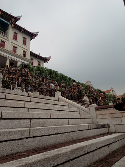 军训,苦在其中,乐在其中,汗水,泪水,欢笑,一同浸染着几千名莘莘学子,也将上弦场的草地染成翠绿,显得更生机勃勃,把建南大会堂的墙壁染得朱红,古朴生香。