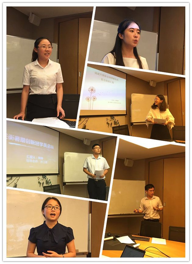 在报告会上,“天衡创新实验班”学员们各自通过PPT演示的方式汇报自己的课题研究成果,对自己的工作学习表现进行了总结,展示了实习培训期间的收获与成长。现场的评委老师对每个学员的成果一一进行了点评。本次实验班,提供多个前沿课题,例如:宅基地制度改革试探、船舶抵押权、破产重整中债权人与股东利益的平衡等,让各位学员根据专业和兴趣自主选择课题,并在律所资深律师和在校老师的双指导下,以论文的形式完成课题研究。同时为了提升学员的实务能力,为创新实验班学员专门开设了初级律师实务课程培训,包括了可视化、庭审技巧、法律文书写作、法律检索等基础实务课程。