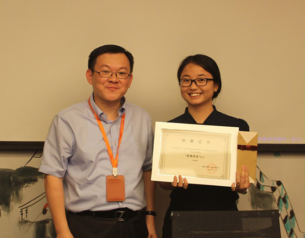 (刘学敏和吴旭阳副教授为优秀学员叶远燕颁发奖状)