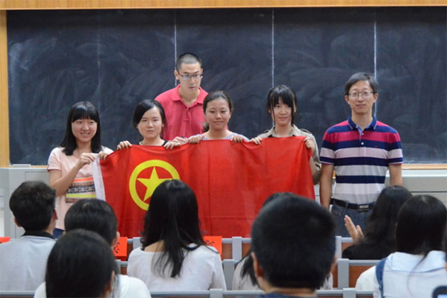 授旗仪式开始,各实践队代表上台由党委副书记郭锦星授予党旗、团委书记高斌授予团旗、辅导员宋磊华、杨璐授予实践队队旗。