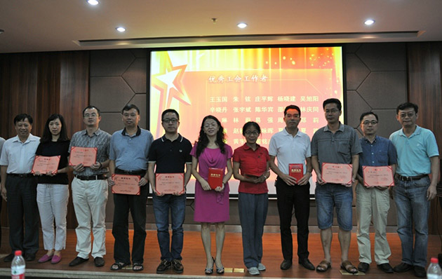 陈毅辉副主席宣读《关于表彰2014-2015年度厦门大学工会先进集体、先进教工小家、优秀工会工作者、工会活动积极分子的决定》,赖虹凯、宋毅等领导们分别为获奖的集体和个人代表颁奖。