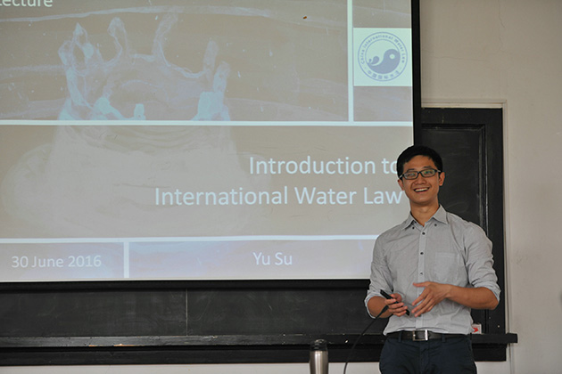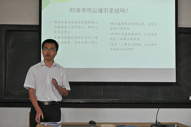 随后竞赛正式开始。第一位上台的苏宇老师,展示了“为何我们需要国际水法”的英语教学内容;紧接着杨帆老师以《法律英语》课程中三位同学提交的课堂作业为范本,指出三份法律文书写作过程中所隐含的英语法律思维问题。最后,王云清老师以近期某基层法院在判决文书中援引《圣经》为例,探讨了司法裁判中“非正式法律渊源”的运用问题。