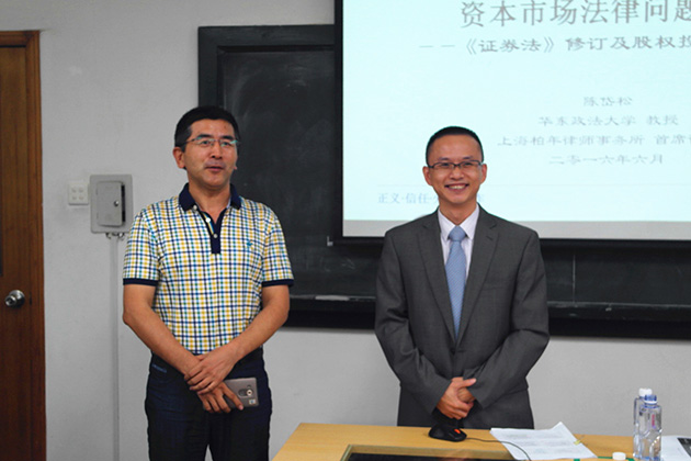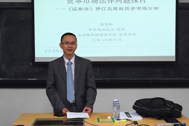 2016年6月2日晚8点,由yl8cc永利官网金融法研究中心和福建远大联盟律师事务所联合举办的厦门大学“远大”金融法高端论坛系列讲座之“资本市场法律问题探讨——《证券法》修订及股权投资市场分析”在永利官网B520教室如期举行。本次讲座有幸邀请到了华东政法大学教授、上海柏年律师事务所首席律师陈岱松老师作为主讲人,yl8cc永利官网肖伟教授主持了此次讲座。讲座现场座无虚席,陈岱松老师也知无不言,结合自身丰富的理论知识及实践经验,为同学们带来一场精彩绝伦的讲座。