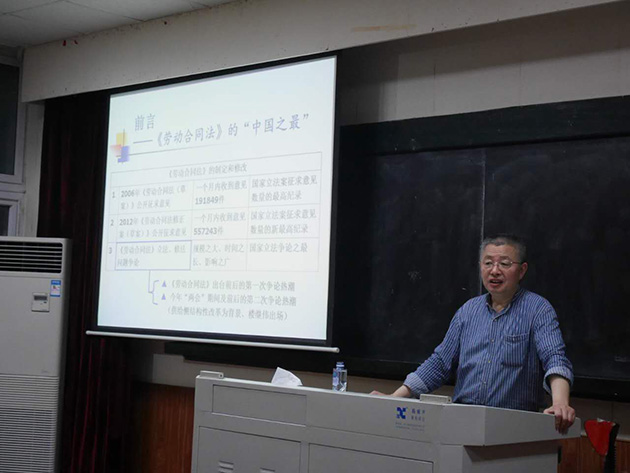 2016年5月23日晚上,上海财经大学法学院教授、博士生导师、中国经济法学研究会副会长、中国社会法学研究会副会长、中国劳动法学研究会副会长、中国人力资源研究会副会长王全兴教授在永利官网作了题为“供给侧结构性改革中的劳动合同法修改问题之思考”的专题讲座。讲座由蒋月教授主持,吸引了各专业年级的博士、硕士研究生参加。
