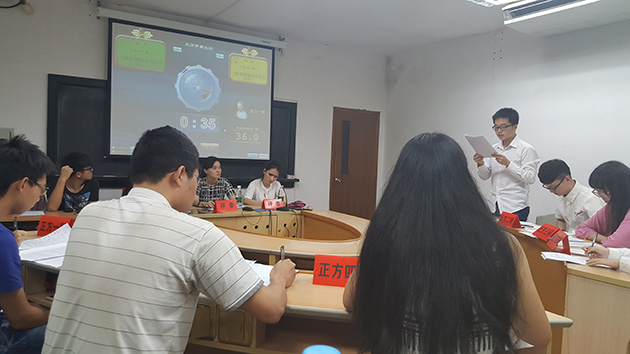 比赛双方按照正常辩论程序,围绕着复赛题目“陪审团制度是否适合中国”展开了新一轮的言辞辩论,双方你来我往,各不相让。在双方辩手大展身手之后,评委就双方队伍的表现进行了相应的点评,并给出参赛队伍各自得分。