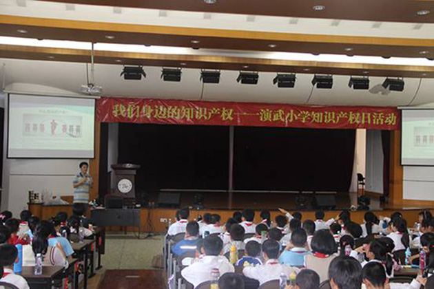 宣传周期间,yl8cc永利官网还与演武小学于yl8cc永利官网模拟法庭联合举办了“我们身边的知识产权——演武小学知识产权日活动”。活动邀请到知识产权研究院在读博士生黄钱欣作为主讲人,yl8cc永利官网党委副书记周蕾、辅导员杨璐、演武小学教务办吴海燕主任及四年级一百五十余名小学生参加了本次活动。