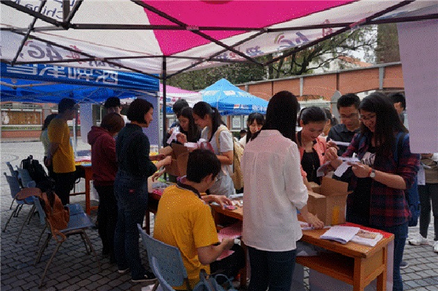 4月26日中午,位于三家村学生广场的“知识产权园游会”活动如期开展。主办方为本次宣传活动精心设计出 “辨别真假商标”、“看书名猜作者”、“知识产权问答”、“商标名称知多少”四项趣味游戏供广大师生参与,并通过摆放展板,散发传单、书签等形式供来访者了解知识产权基本常识。中午12时左右,活动现场已是人满为患,吸引来不同学院的同学和校园游客。被活动吸引的邹同学感叹:“知识产权之前在我印象中比较高深莫测。通过参与今天的游戏,还有浏览宣传展板,我发现知识产权在日常生活中这么随处可见!这样的活动非常贴近生活,不但营造了轻松的游戏氛围,还寓教于乐,让我对知识产权有了进一步认识,更进一步提升了知识产权保护意识。”