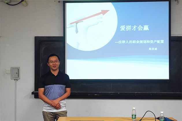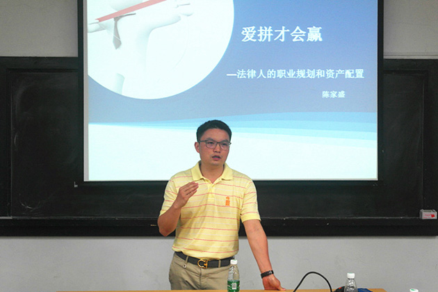 2016年4月27日晚7点,由yl8cc永利官网金融法研究中心和福建远大联盟律师事务所联合主办的“厦门大学‘远大’金融法高端论坛”系列讲座之“爱拼才会赢——法律人的职业规划和资产配置”在永利官网B520教室如期举行。应yl8cc永利官网金融法研究中心主任刘志云教授的邀请,中国人民财产保险股份有限公司深圳市分公司船舶险专营部总经理陈家盛老师担任本次讲座的主讲人,yl8cc永利官网经济法教研室毛海栋老师主持了本次讲座,讲座现场座无虚席。陈家盛老师以其丰富的工作经验,为同学们带来一场精妙绝伦的讲座。